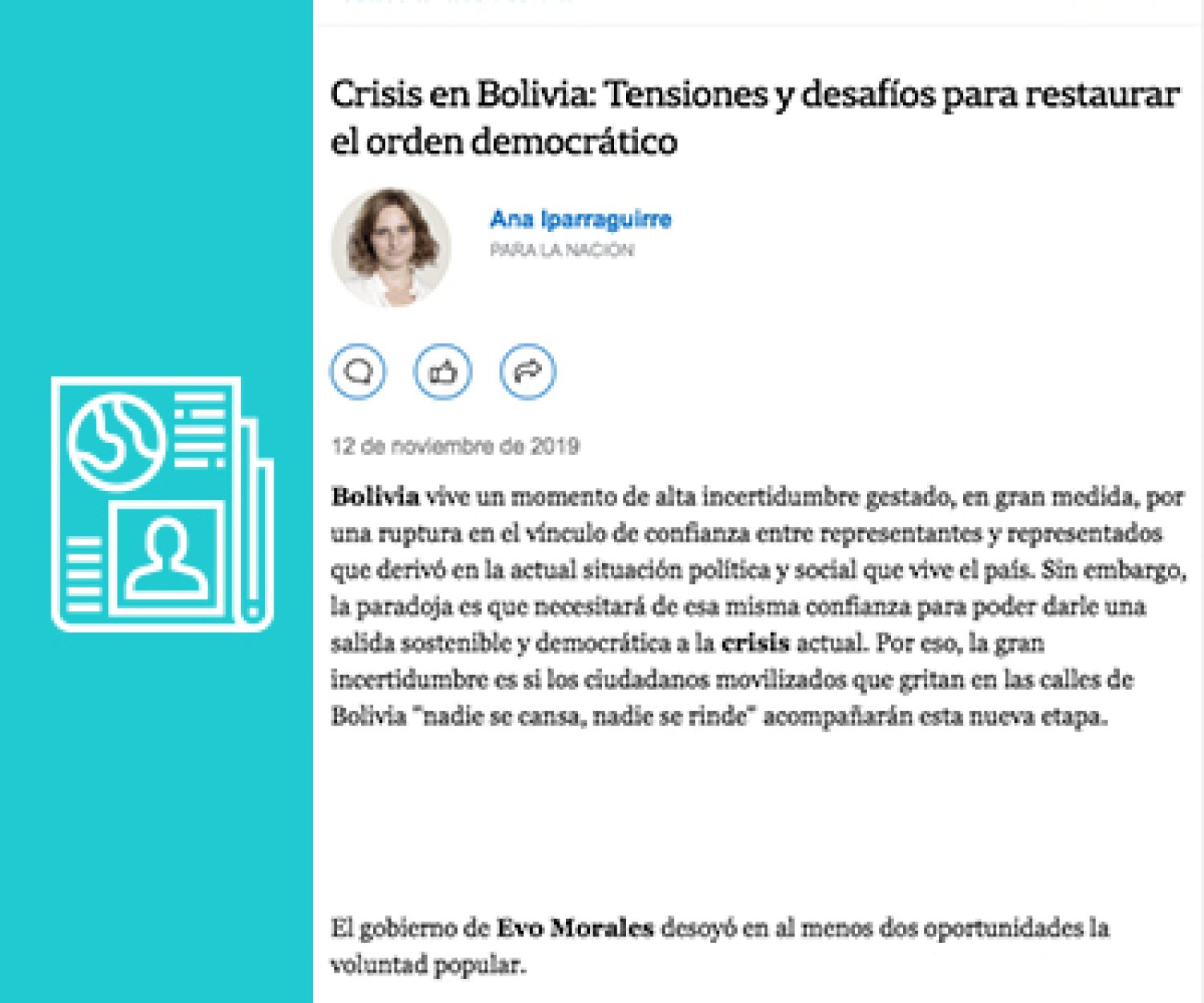 Archivo Crisis en Bolivia: Tensiones y desafíos para restaurar el orden democrático. Ana Iparraguirre para La Nación.